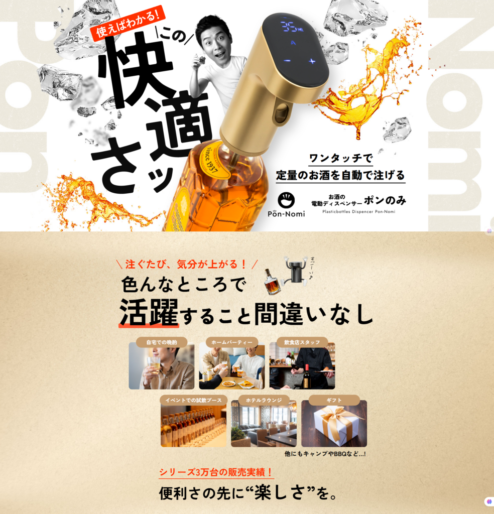 電動ディスペンサー「ポンのみ」シリーズは、お酒を注ぐ手間を減らしたい方や、一定量を安定して注ぎたい方に向けて開発されたアイテムです。 片手で操作できるシンプルな構造で、日常の晩酌からホームパーティーまで幅広いシーンで使いやすい点が特徴です。
