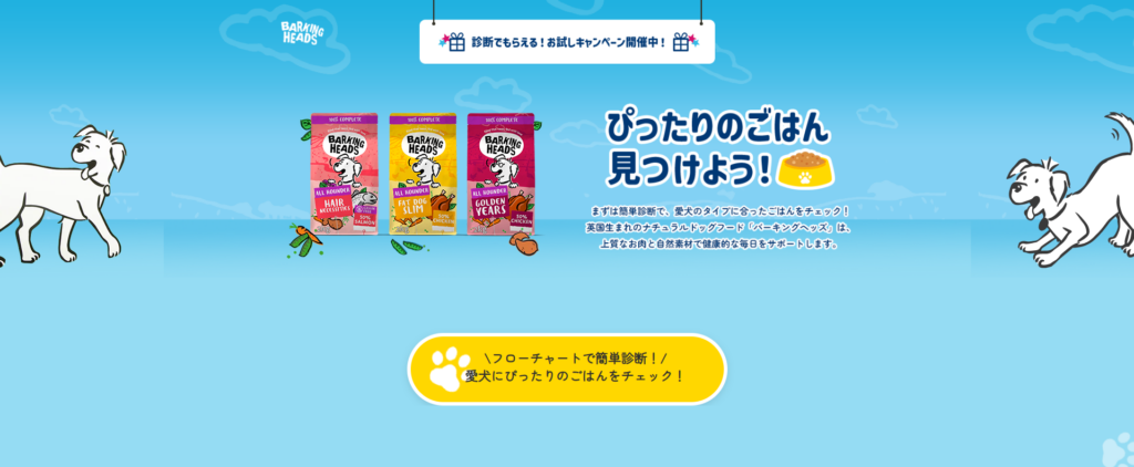 Treats Factoryでは、愛犬の年齢・体質・ライフスタイルに合わせて 最適なドッグフードを見つけられる「簡単診断」をご用意しています。 診断後は、お得なお試しキャンペーンも実施中!